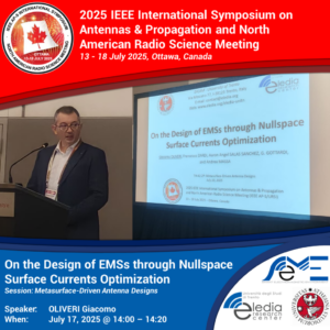 On Thursday, July 17th, 2025, Prof. Giacomo OLIVERI (ELEDIA@UniTN – DICAM) presented a talk at the IEEE APS/URSI 2025 in Ottawa (CA) on “On the Design of EMSs through Nullspace Surface Currents Optimization” as part of the Session on “Metasurface-Driven Antenna Designs“.