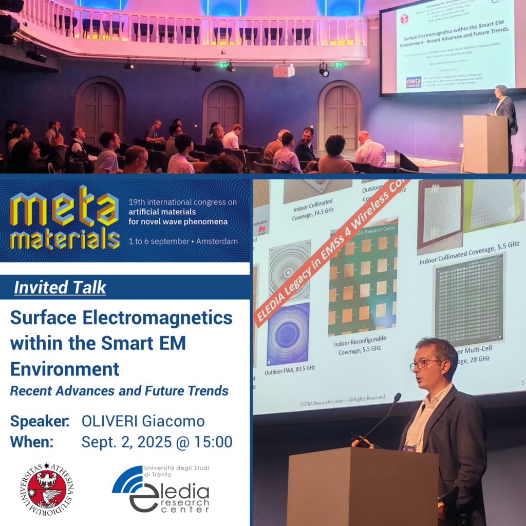 Yesterday, Prof. Giacomo OLIVERI (ELEDIA@UniTN – DICAM) gave an invited talk at the Metamaterials’2025 – 19th International Congress on Artificial Materials for Novel Wave Phenomena held in Amsterdam, titled “Surface Electromagnetics within the Smart EM Environment – Recent Advances and Future Trends“.